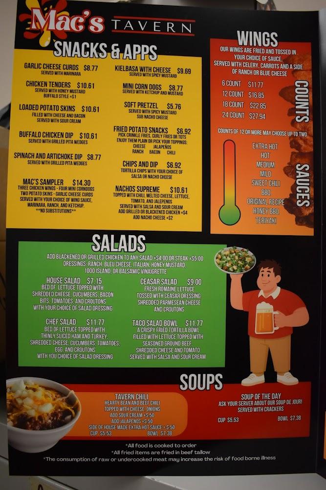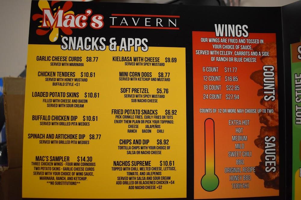 Mac's Tavern features a diverse menu, offering something for everyone. Enjoy classic appetizers like Mac's Sampler with wings, mozzarella sticks, and mini corn dogs. Each dish aims to satisfy and kick-start the fun.